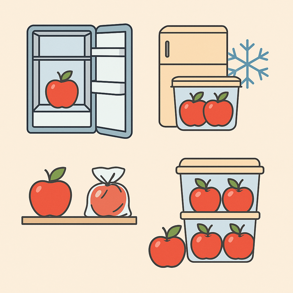 냉장 보관 야채칸·과일칸(0~4°C) 사용, 사과끼리 닿지 않게 개별 랩핑 필수 약 4~6주 신선도 유지 쉽고 실용적 냉장고 문 쪽 피하기, 1~2주마다 점검